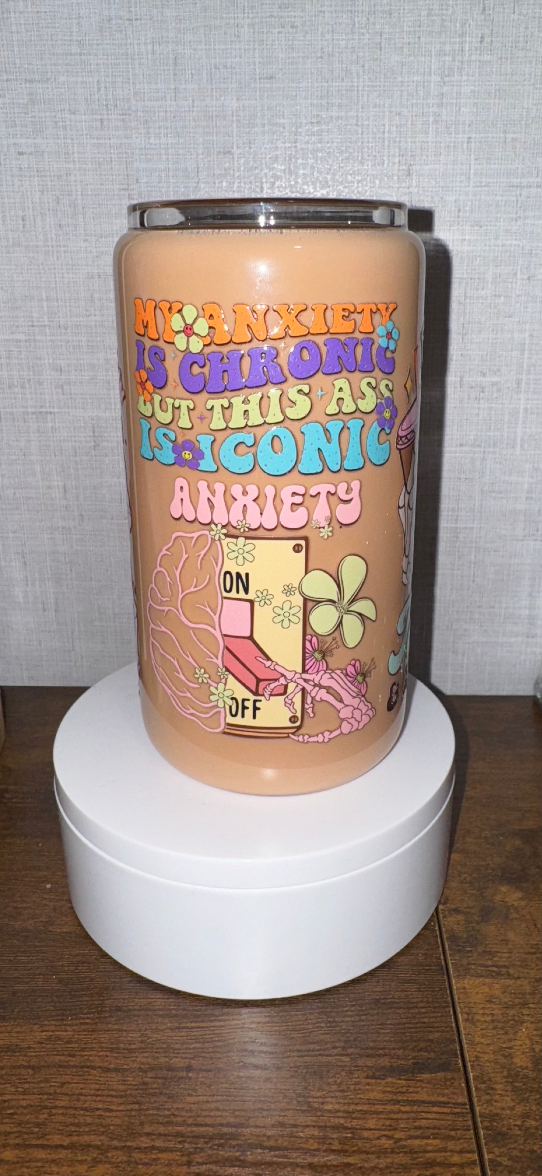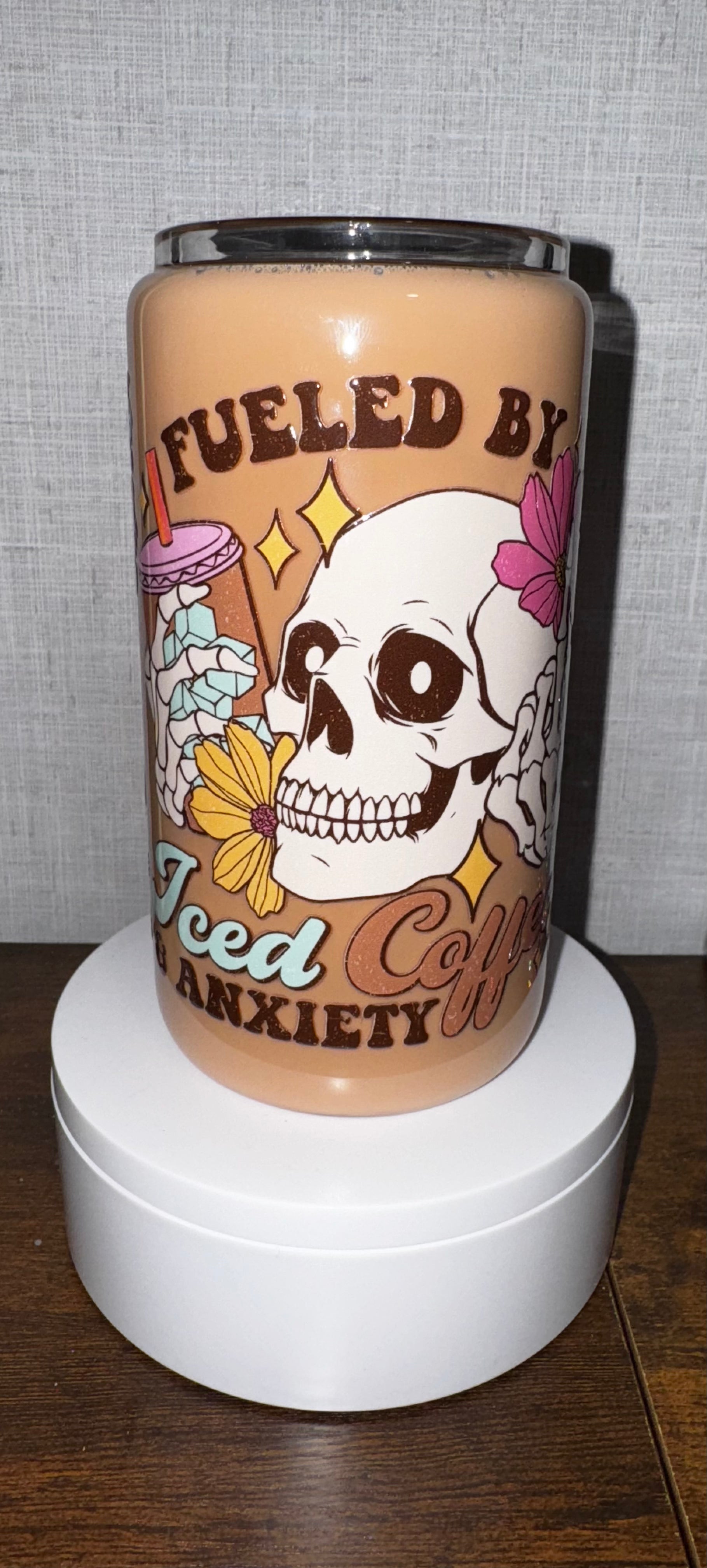 16 oz glass snowglobe cup with “coffee” liquid. Comes with a bamboo lid and plastic straw!